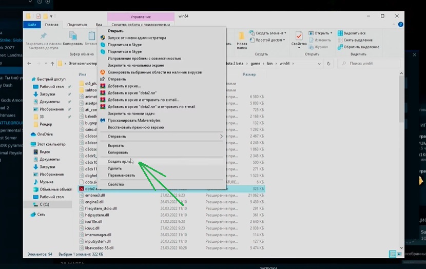 В Steam нажимаем Dota 2, далее «Свойства» — «Локальный файлы» — «Обзор», далее нажимаем на папку «game» — «bin» — «win 64 или win 32» и создаем ярлык «Дота 2».