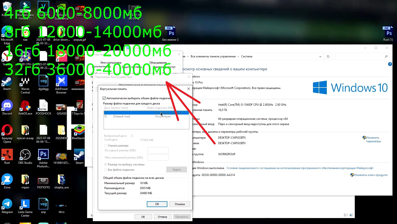 Смотрите, убираем галочку «автоматически выбирать объём файла подкачки», нажимаем «Указать размер» и сюда мы указываем размер, который показан на экране под свою операционную систему, после этого нажимаем «Ок» и закрываем всё.